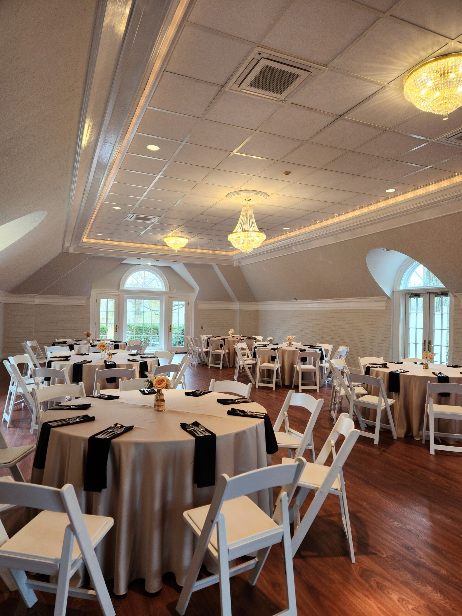 This space offers a more intimate atmosphere in which guests can gather. The Ballroom is situated between two patios so guests can step outside to enjoy the surrounding 70–acres of picturesque gardens, the pool, manicured lawns, serene woods and stunning sunsets.