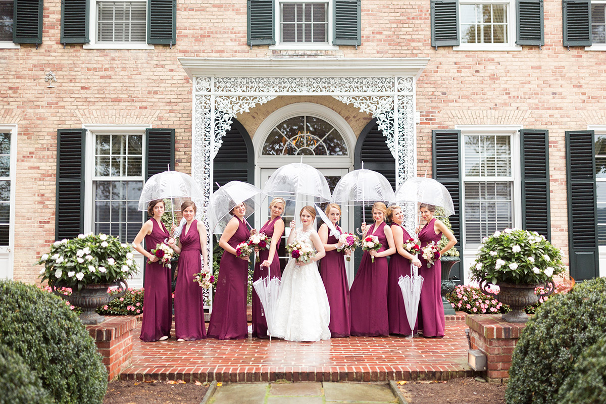 Pro Tip: Investing in umbrellas for the whole wedding party will be key to making your rainy wedding photos stand out. Clear umbrellas are your best bet for wedding photos since they won’t obstruct the view or cast a shadow on your face.